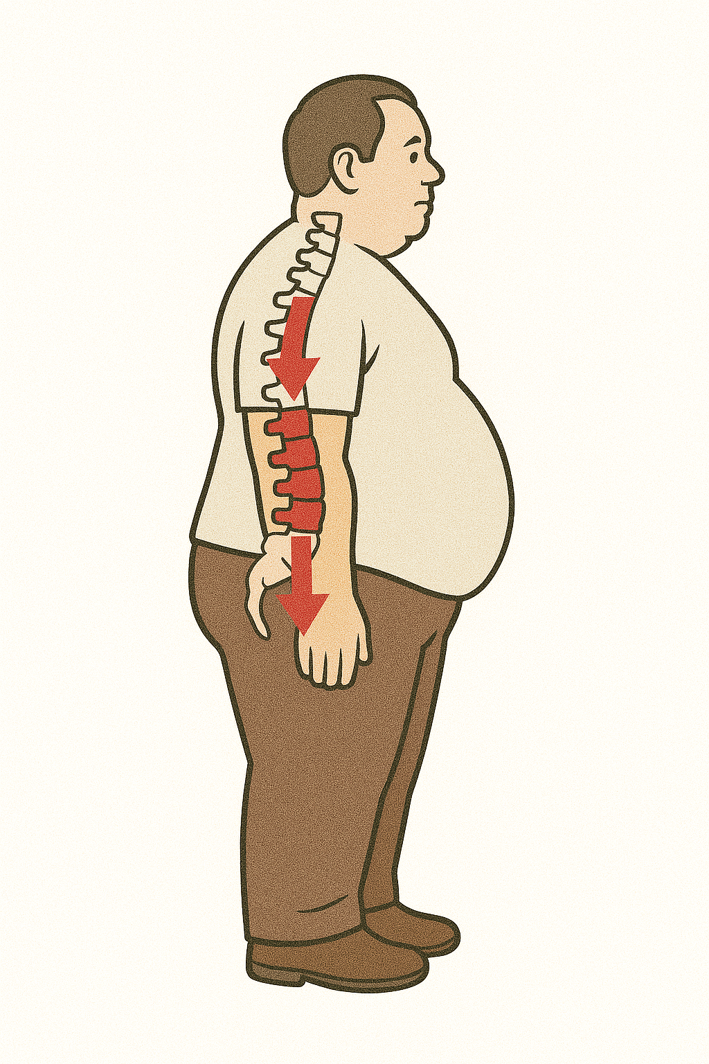 우리의 체중은 척추에 직접적인 하중으로 작용합니다. 체중이 많이 나갈수록 디스크가 부담해야 하는 무게도 커지죠. 마치 항상 필요 이상의 무거운 짐을 지고 다니는 것과 같습니다. 과도한 하중은 디스크의 퇴행을 가속화시키고 손상 위험을 높입니다.