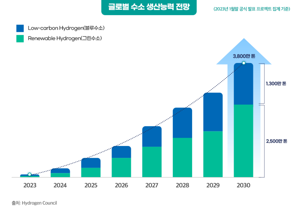 전 세계 수소 생산량은 꾸준히 증가하는 추세다. 2023년부터 2030년까지의 예측에 따르면 수소 생산량은 3.8백만 톤에 이를 것으로 전망된다. 최근 그래프를 보면 저탄소 수소와 재생 가능 수소의 비중이 점진적으로 높아지고 있음을 알 수 있다. 현재 수소 생산의 주요 원천은 여전히 화석 연료 기반이지만, 청정 에너지로의 전환이 서서히 진행되고 있다.